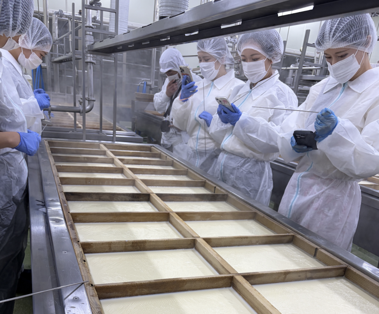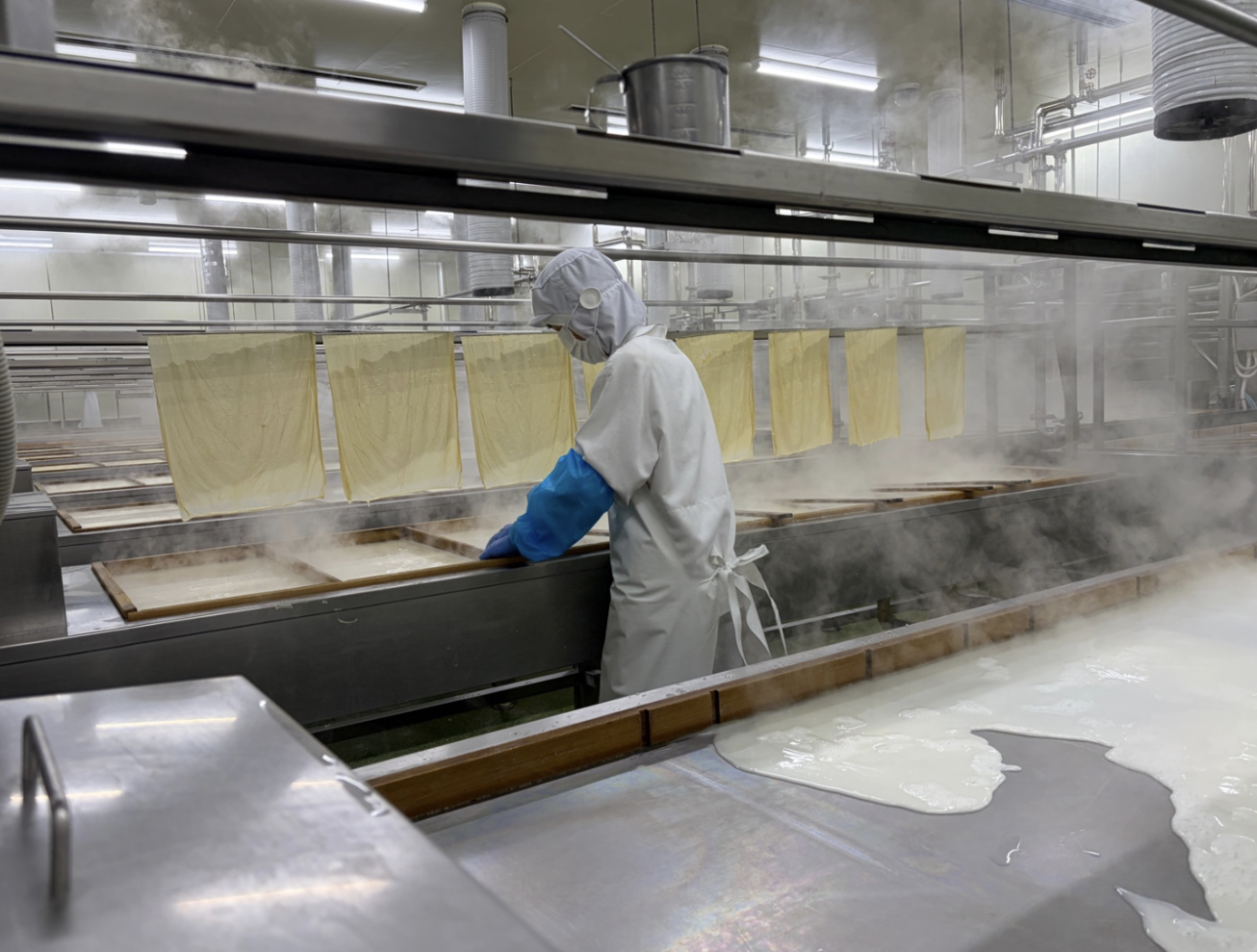 工場見学では、普段お店で食べている湯葉や豆腐ができる瞬間を見て、