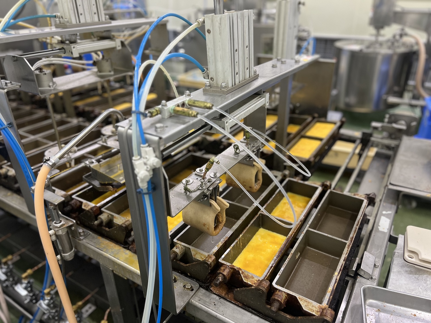 お豆腐が作られる工程をしっかり見学して、次は、最初に見学させていただいた、湯葉引きをするエリアの奥へ。ここには、後から追加で作られた、だし巻き卵のエリアがありました。