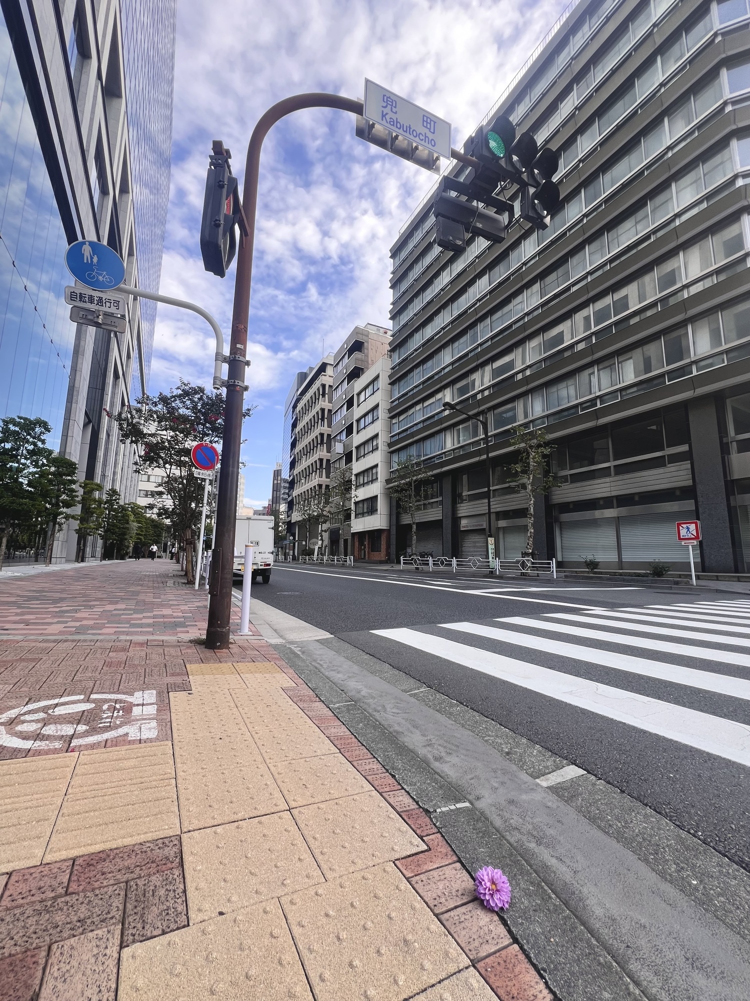 翌朝、兜町・茅場町の交差点で、ピンク色のまあるいお花を発見。