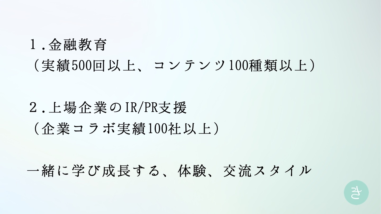 女性を中心とした、金融教育と上場企業の女性投資家向けIR支援事業。