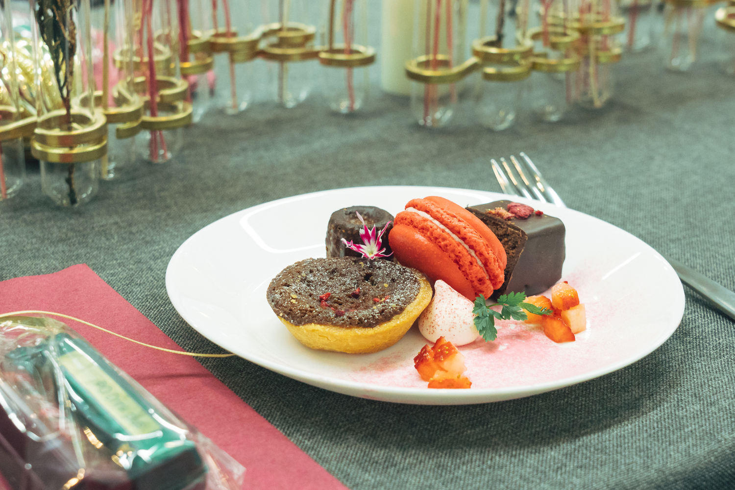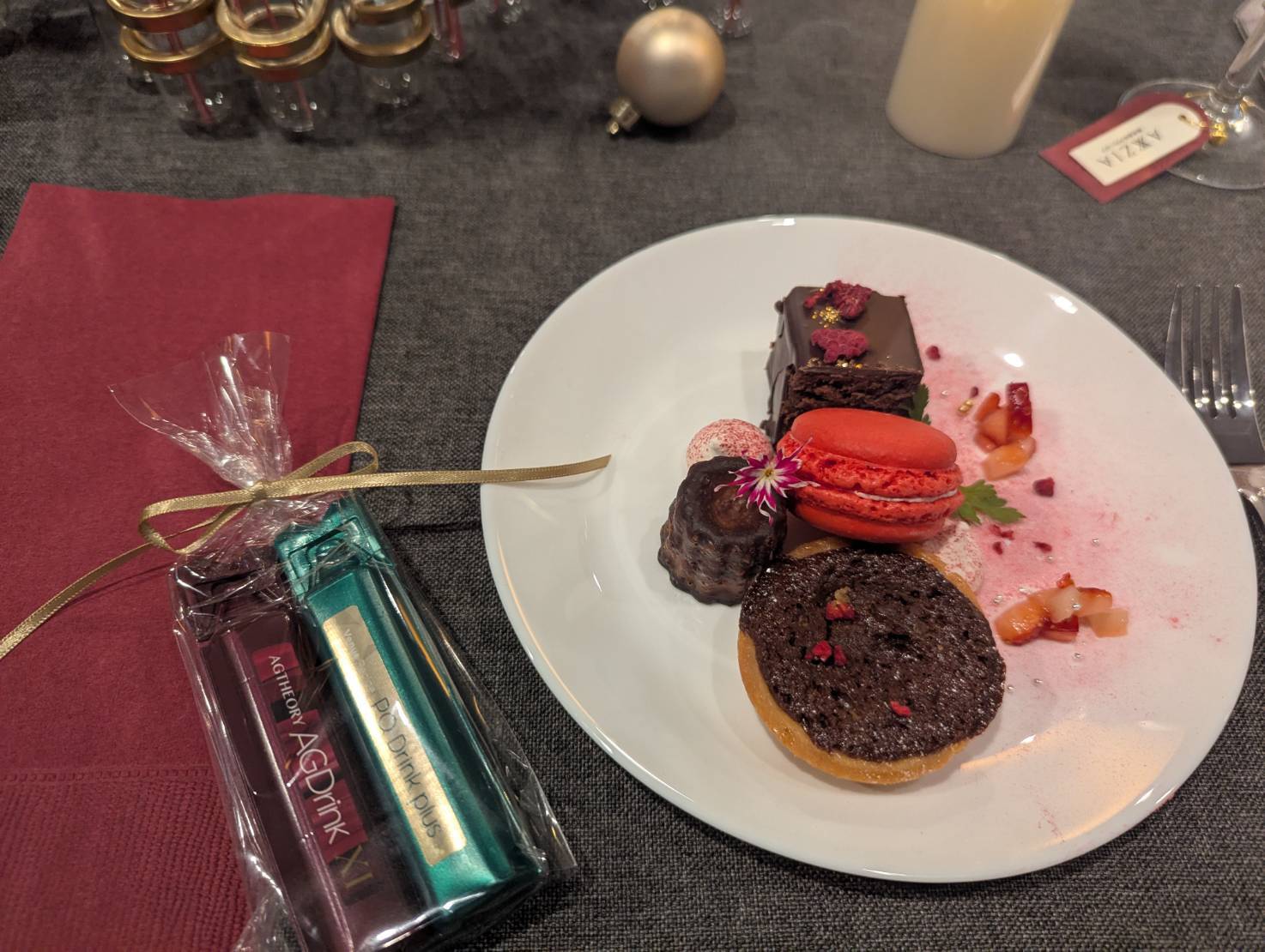 スイーツの盛り付けは、ミニカヌレ、ムラングフランボワーズ、チョコケーキ、そしてピエール・エルメのマカロンが白いお皿に並べられ、フランボワーズパウダーがかかった一皿の素敵な演出があり、クリスマスを感じられる豪華な空間でした🎁